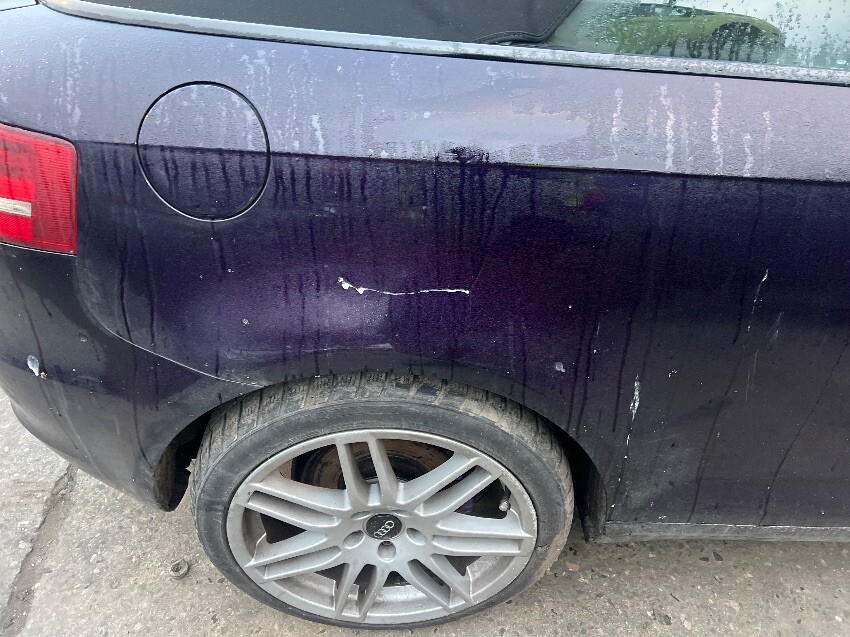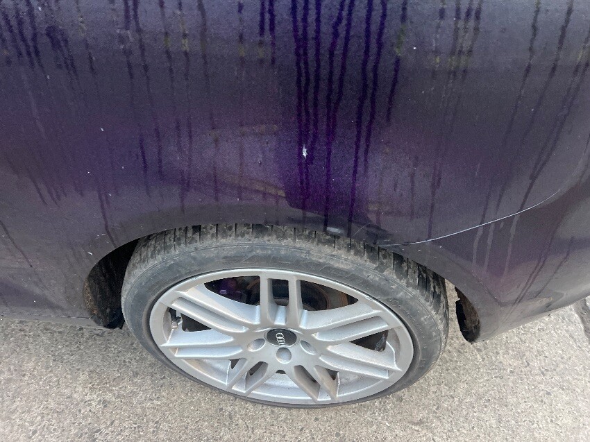 Painted purple , engine rattle, rear bumper, offside front passenger door window, offside rear wheel arch, nearside rear wheel arch, nearside front wing, front bumper, general wear and tear.
