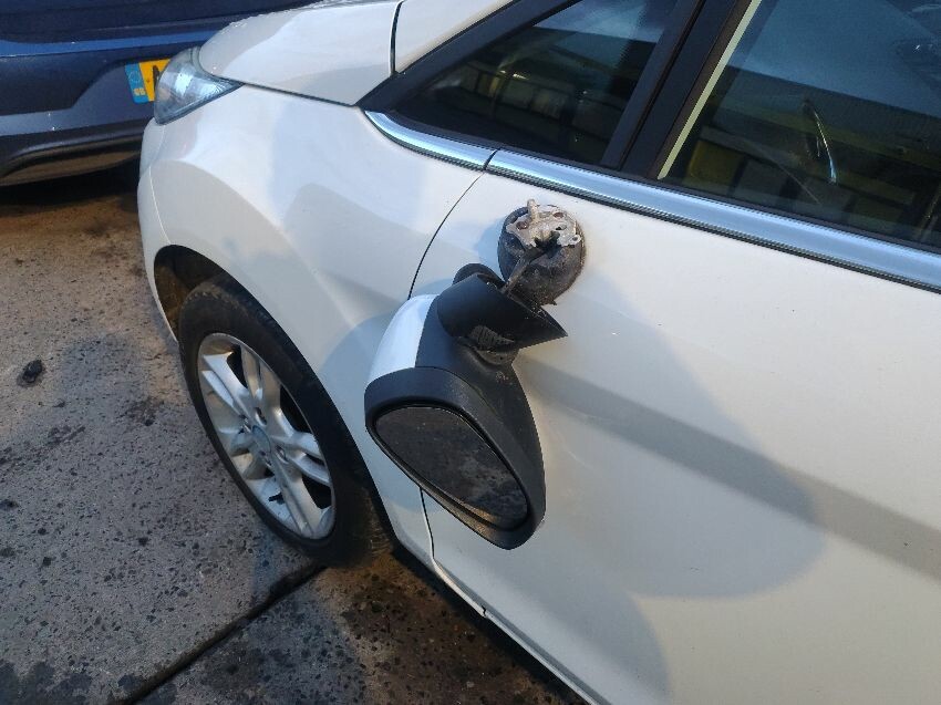 Deadlocked, drivers side mirror broken, front bumper damage, passenger side mirror broken, scratches all over