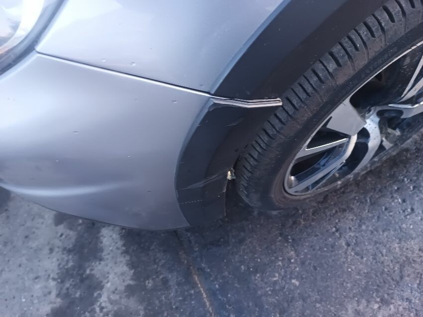 Rear bumper bent, rear hatch dented, trim loose, front bumper damaged & loose, rear bumper loose, window washer spray nozzle loose, windscreen cracked, general wear and tear