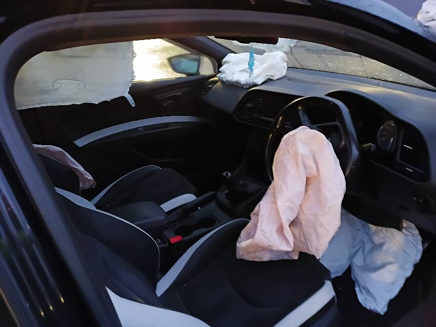Front bumper, bonnet, grill, lights, radiator, engine, n/s wing, suspension, wheels, sill, door, qtr panel, back bumper, o/s qtr panel, door, sill, wing mirror, wing, scuffs wear and tear airbags deployed, hole in engine.